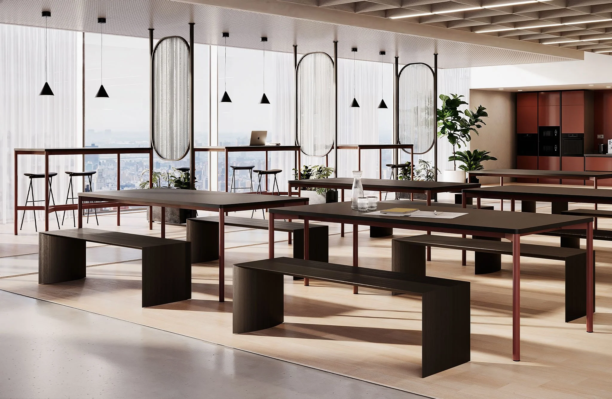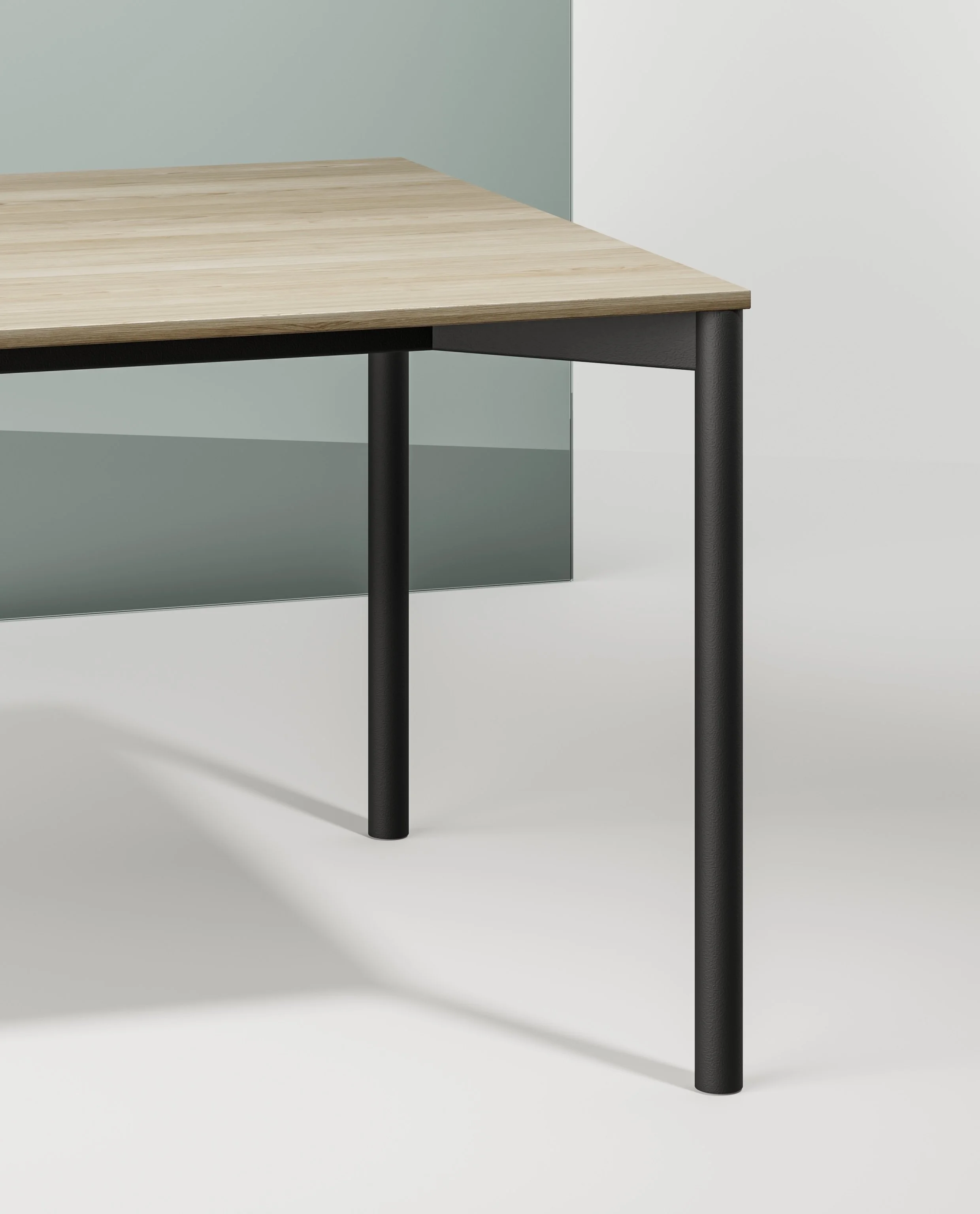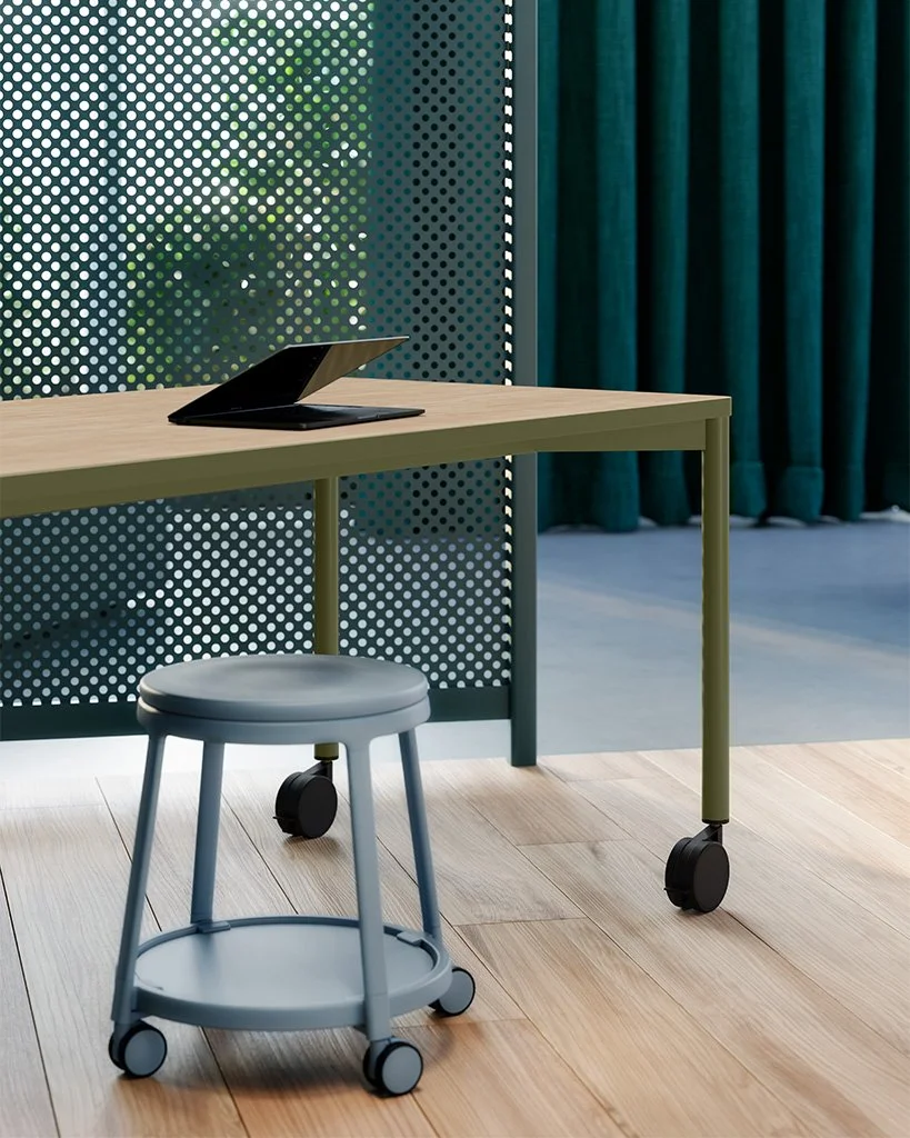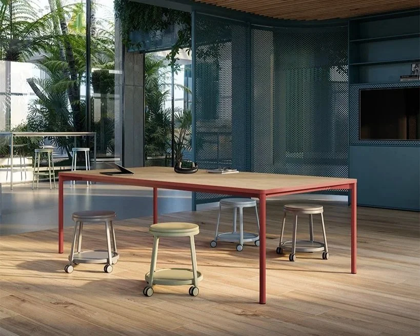 La colección incluye elementos en dos alturas: el clásico escritorio para el trabajo concentrado y las reuniones estructuradas, y Meeting, mesas altas con reposapiés integrados, concebidas para crear estaciones de trabajo inteligentes en coworking, bares o cafeterías, así como para encuentros informales o el trabajo de pie.