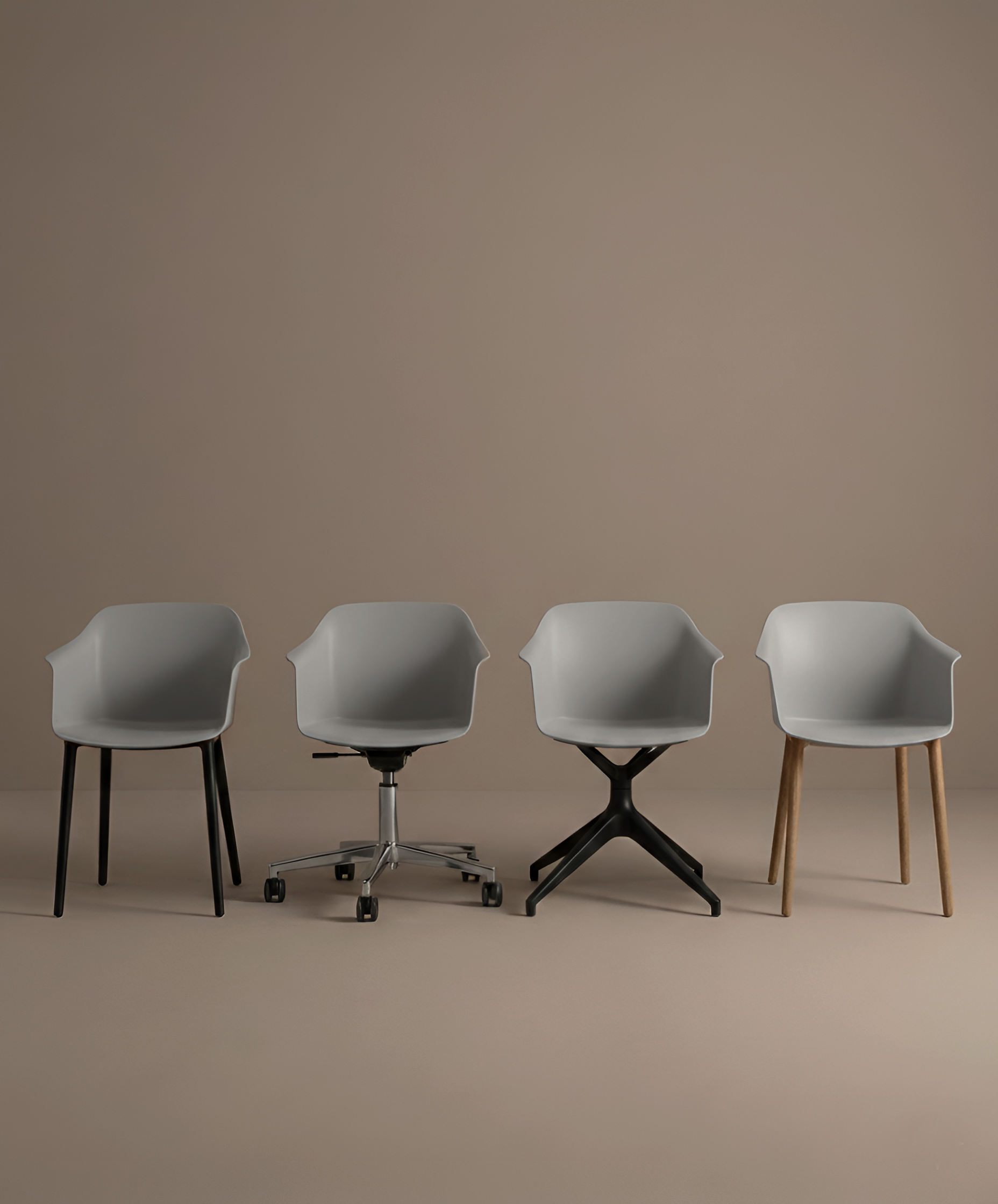 Antonella nace para cubrir un vacío: una silla contract que armoniza lo profesional y lo cotidiano, capaz de transformarse según el entorno. Inspirada en las familias de sillas europeas que combinan poliéster, madera y metal, su misión es ofrecer un renacer continuo, de cafeterías a oficinas híbridas, de hoteles a zonas lounge.